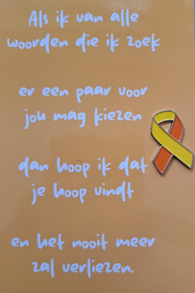 Dit lintje draag ik om te helpen het taboe op praten over zelfdoding te doorbreken. Het is een teken van hoop, verbinding en herinnering.